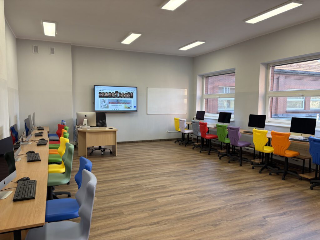 już od 1 września 2025 – uczniowie weszli do nowej pracowni komputerowej Apple. Dotychczasowe komputery iMac z procesorami Intel zostały zastąpione nowoczesnymi jednostkami MacMini z procesorem M1. Pracownia nadal składa się z 13 stanowisk. Dzięki wymianie sprzętu zyskaliśmy znacznie lepsze warunki do nauki. Zastosowany w komputerach procesor M1 potrafi trzykrotnie szybciej dokonywać obliczeń od obecnie wykorzystywanego przez nas sprzętu. Uzupełnieniem komputerów są monitory marki Iiyama. Starszy sprzęt (komputery Apple iMac) trafił do sali 50B, gdzie uczą się młodsi uczniowie naszej Szkoły.