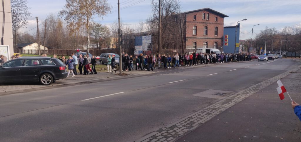12.11 w naszej szkole obchodziliśmy Święto Niepodległości. Wszyscy uczniowie wraz z dyrekcją szkoły i nauczycielami zebrali się na szkolnym podwórku. Odśpiewaliśmy hymn Polski, obejrzeliśmy chwytający za serce występ uczennic klasy 3b. Wielu uczestników wydarzenia przypięło do ubrania biało-czerwoną wstążkę lub kotylion. Wzorem ubiegłego roku po apelu przeszliśmy przez ulice naszej dzielnicy, manifestując swoją radość z życia w wolnej Polsce.