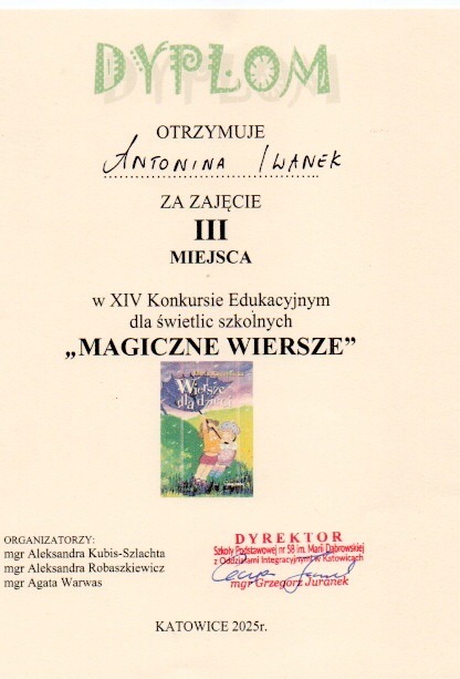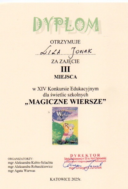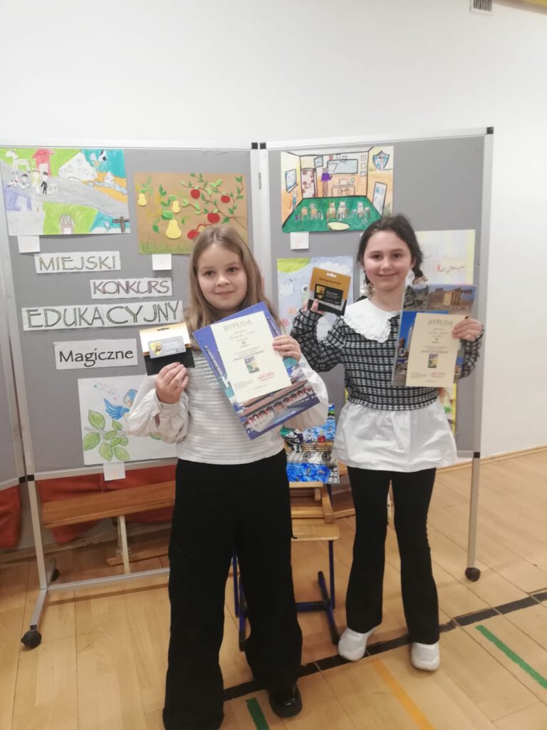 W dniu dzisiejszym (19.11.2025r) uczennice klasy IIIb Antonina I. oraz Lila J. zdobyły III miejsce w Miejskim Konkursie Edukacyjnym „Magiczne wiersze”. Tematyka konkursu obejmowała twórczość Marii Konopnickiej. Uczennice wykonały pracę plastyczną do wybranego wiersza oraz zapoznały się z 30 wierszami Marii Konopnickiej. W swoją pracę włożyły dużo wysiłku.