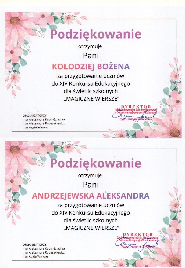 W dniu dzisiejszym (19.11.2025r) uczennice klasy IIIb Antonina I. oraz Lila J. zdobyły III miejsce w Miejskim Konkursie Edukacyjnym „Magiczne wiersze”. Tematyka konkursu obejmowała twórczość Marii Konopnickiej. Uczennice wykonały pracę plastyczną do wybranego wiersza oraz zapoznały się z 30 wierszami Marii Konopnickiej. W swoją pracę włożyły dużo wysiłku. Gratulujemy!!!!
