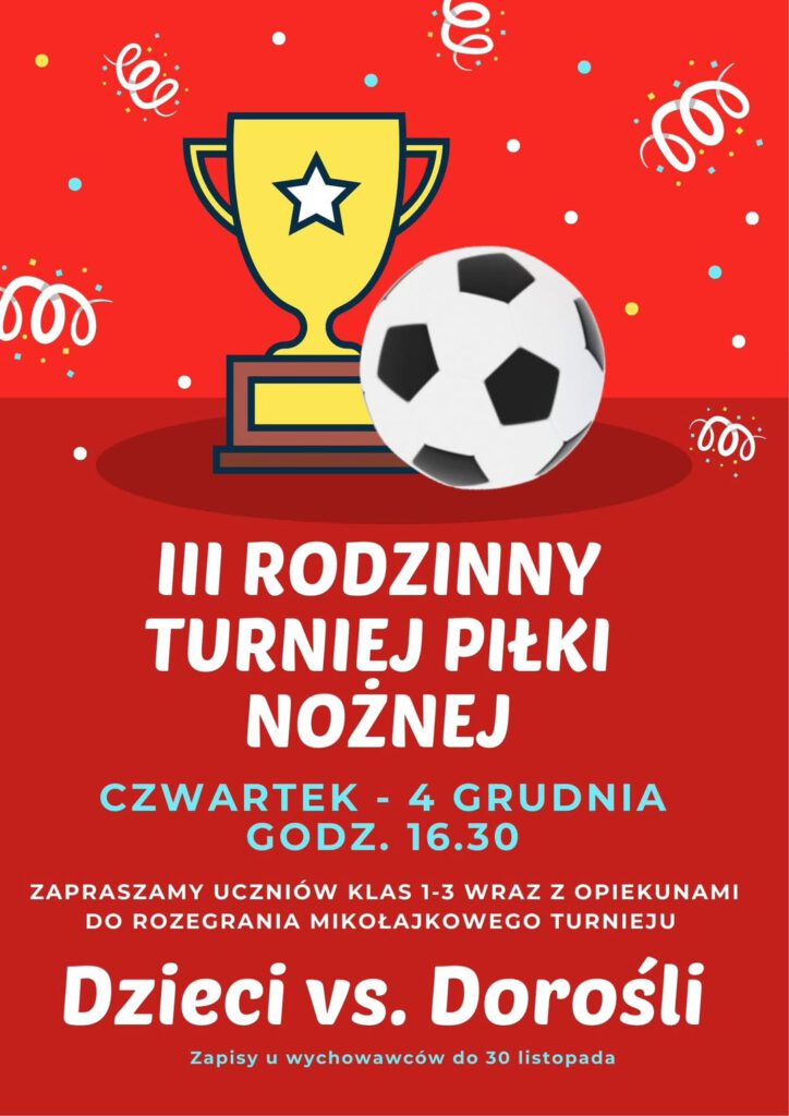 Już 4 grudnia o godz. 16:30 w naszej nowo wybudowanej hali sportowej odbędzie się III RODZINNY TURNIEJ PIŁKI NOŻNEJ.