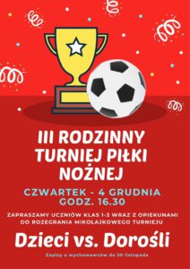 Serdecznie zapraszamy na wyjątkowe sportowe wydarzenie! Już 4 grudnia o godz. 16:30 w naszej nowo wybudowanej hali sportowej odbędzie się III RODZINNY TURNIEJ PIŁKI NOŻNEJ....